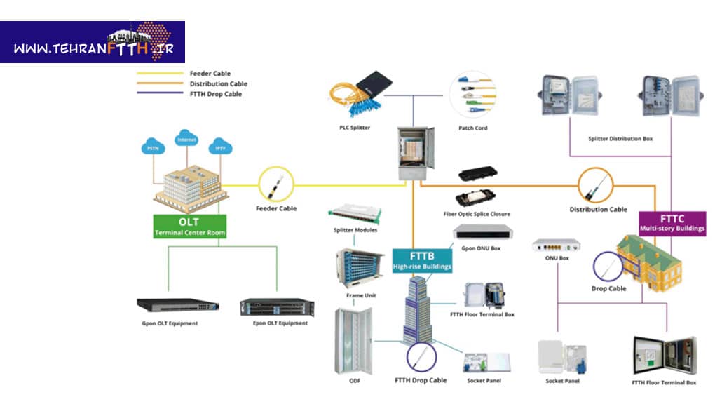 به صورت کلی مسیر فیبر نوری در بستر FTTH از مرکز مخابراتی تا منزل یا محل کار شما با شرح تجهیزات پسیو و یا اکتیو به صورت زیر می باشد :