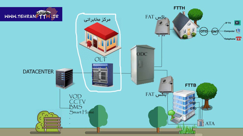 در مرحله اول شما می توانید با نگاه کردن به عکس زیر مسیر فیبر نوری رو از مرکز مخابراتی تا منزل یا محل کارتان می ببینید . اگر می خواهید اطلاعات بیشتری از FTTH داشته باشید می توانید مقاله FTTH چیست را در سایت تهران فیبر مشاهده نمایید .
